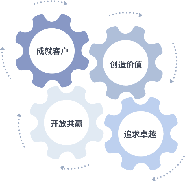 成就客户是一切决策的出发点,,,,创造价值是衡量所有工作的标准,,,追求卓越是我们做事做人的态度,,,,开放共赢是我们的格局也是最终的结果。。。。价值观的齿轮环环相扣,,推动着组织里的每个人不断向前。。