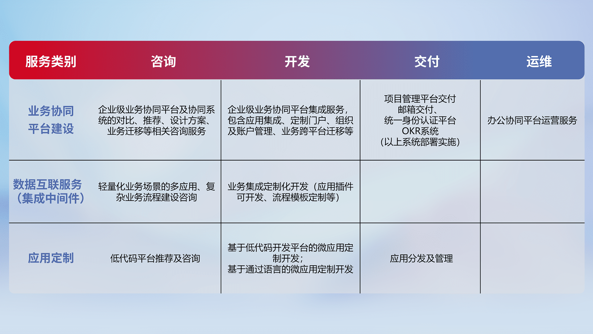 针对钉钉、、、、企微、、IDaas等平台级产品提供产品的规划、、方案、、、交付、、、定制化开发等服务,,,,实现如统一协同办公、、智能客户服务、、、混合会议管理、、、、智能数据查询、、、等业务场景,,,,实现数字化转型。。。